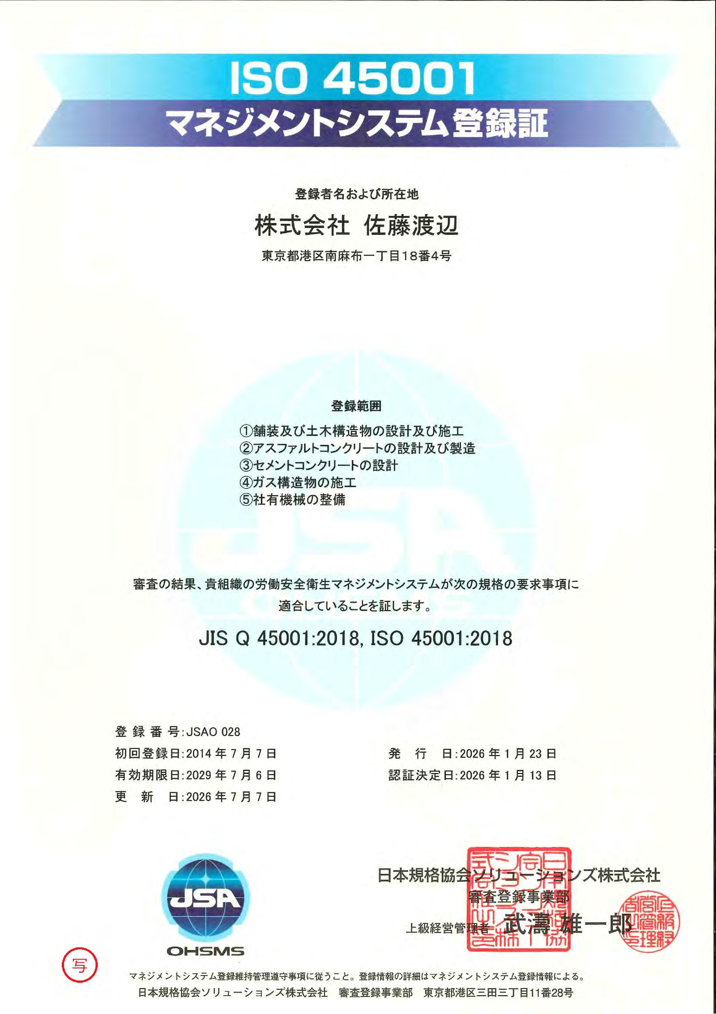 適切な安全衛生体制の構築と運用、ならびに安全衛生方針の確実な履行のために2014年7月にOHSASに登録し、2021年1月に ISO45001に移行登録しました。