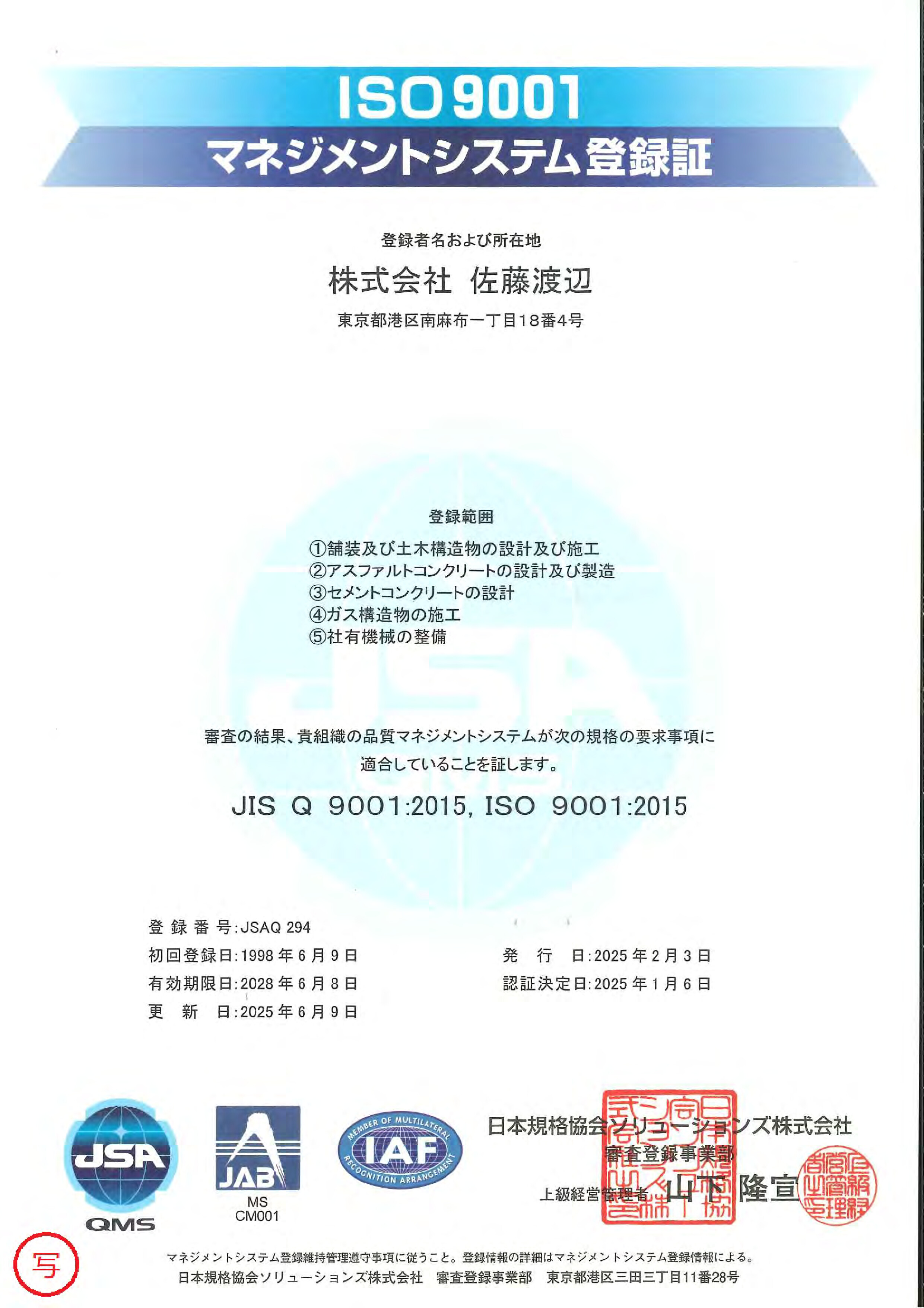 適切な品質マネジメントシステムの構築・維持を図り、品質方針の確実な履行のため、1998年6月にISO9001を取得しました。
